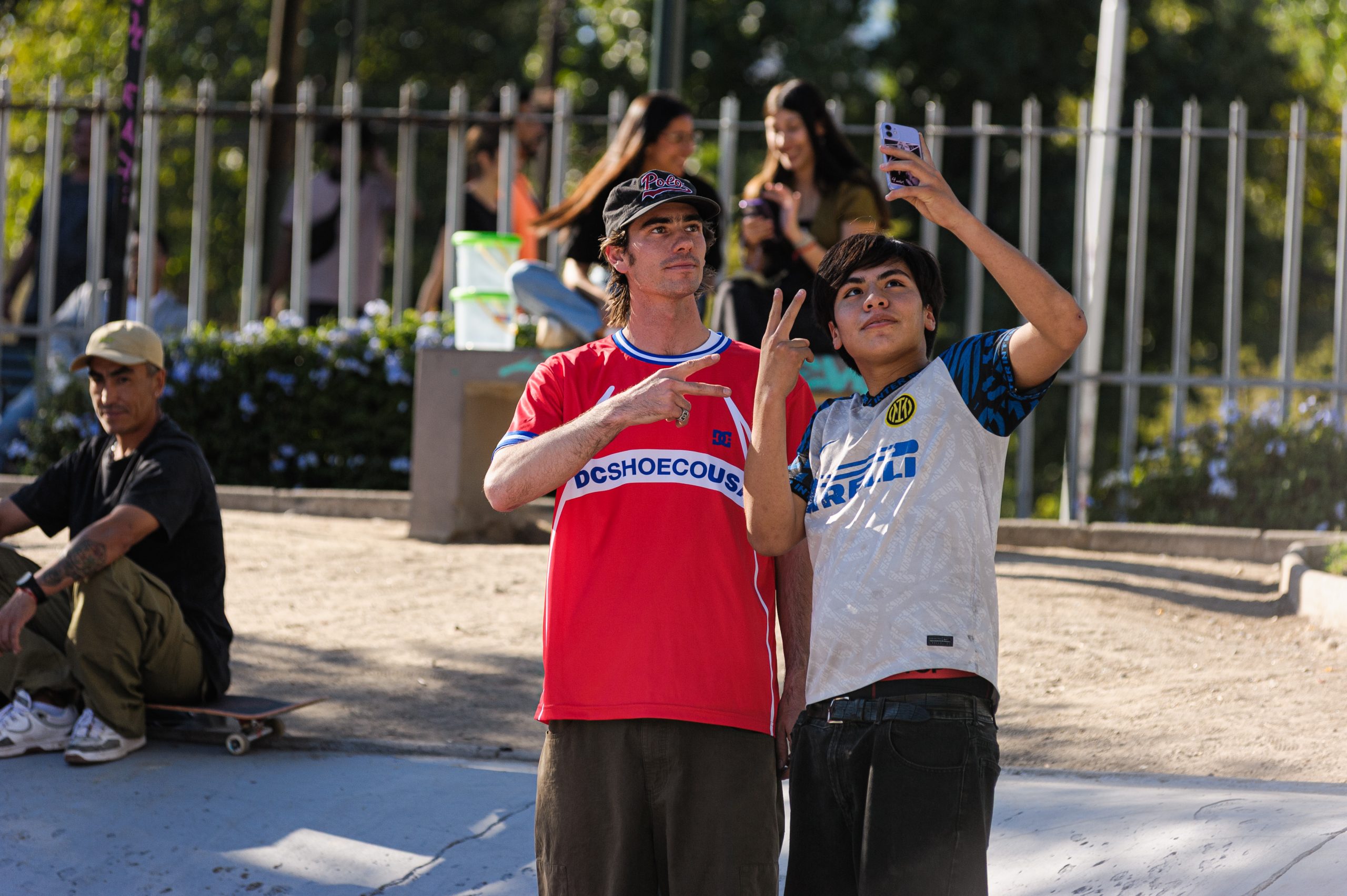 La jornada comenzó en el Skatepark de Las Condes, donde se realizó una firma de autógrafos y una sesión abierta para familias y niños, generando un ambiente cercano y lleno de energía desde temprano.