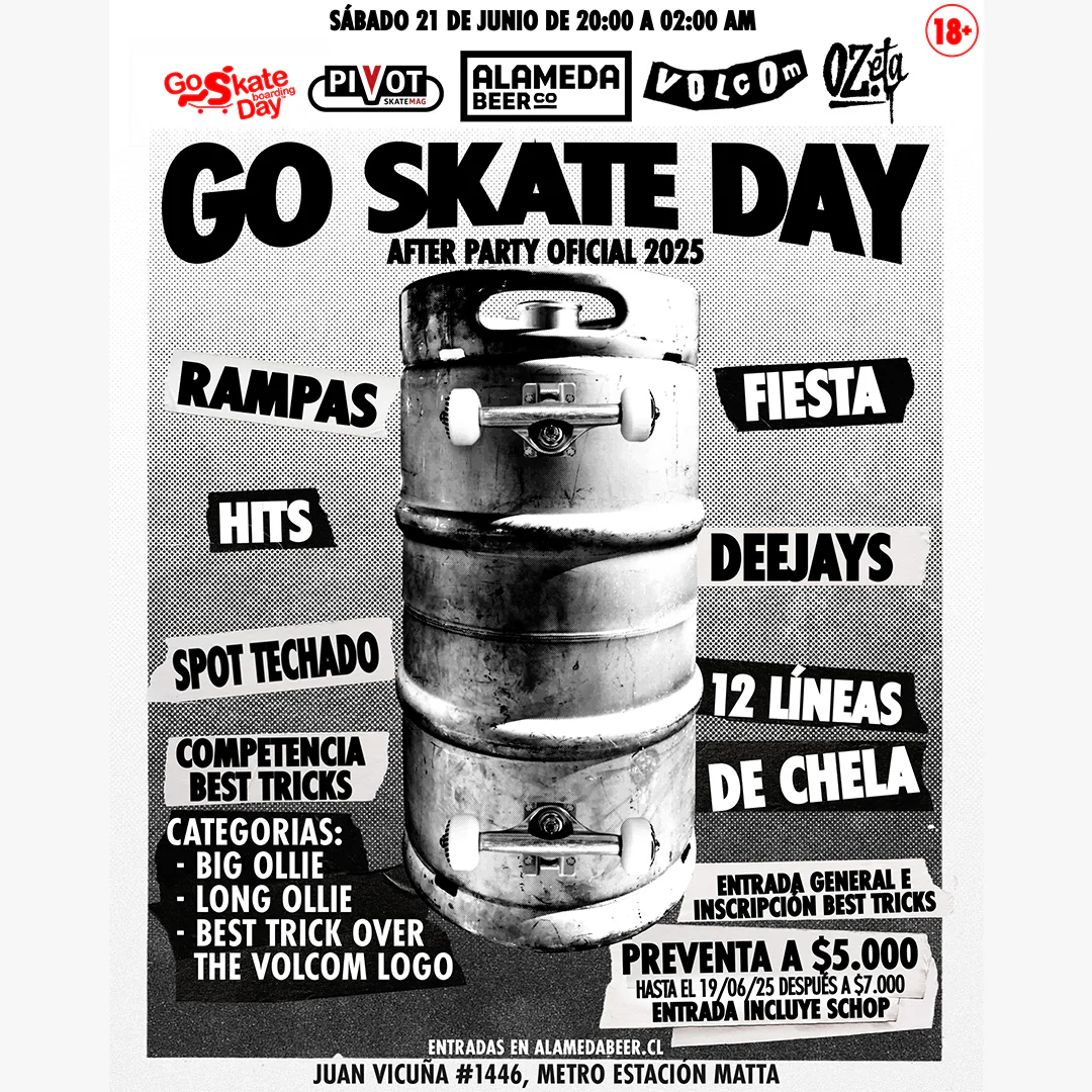Spot techado con rampas, hits, 12 líneas de cerveza y el mejor ambiente para bacilar este Go Skate Day 2025 junto a @volcom_chile @andpac.cl @alamedabeerco y @oz.eta 🍻