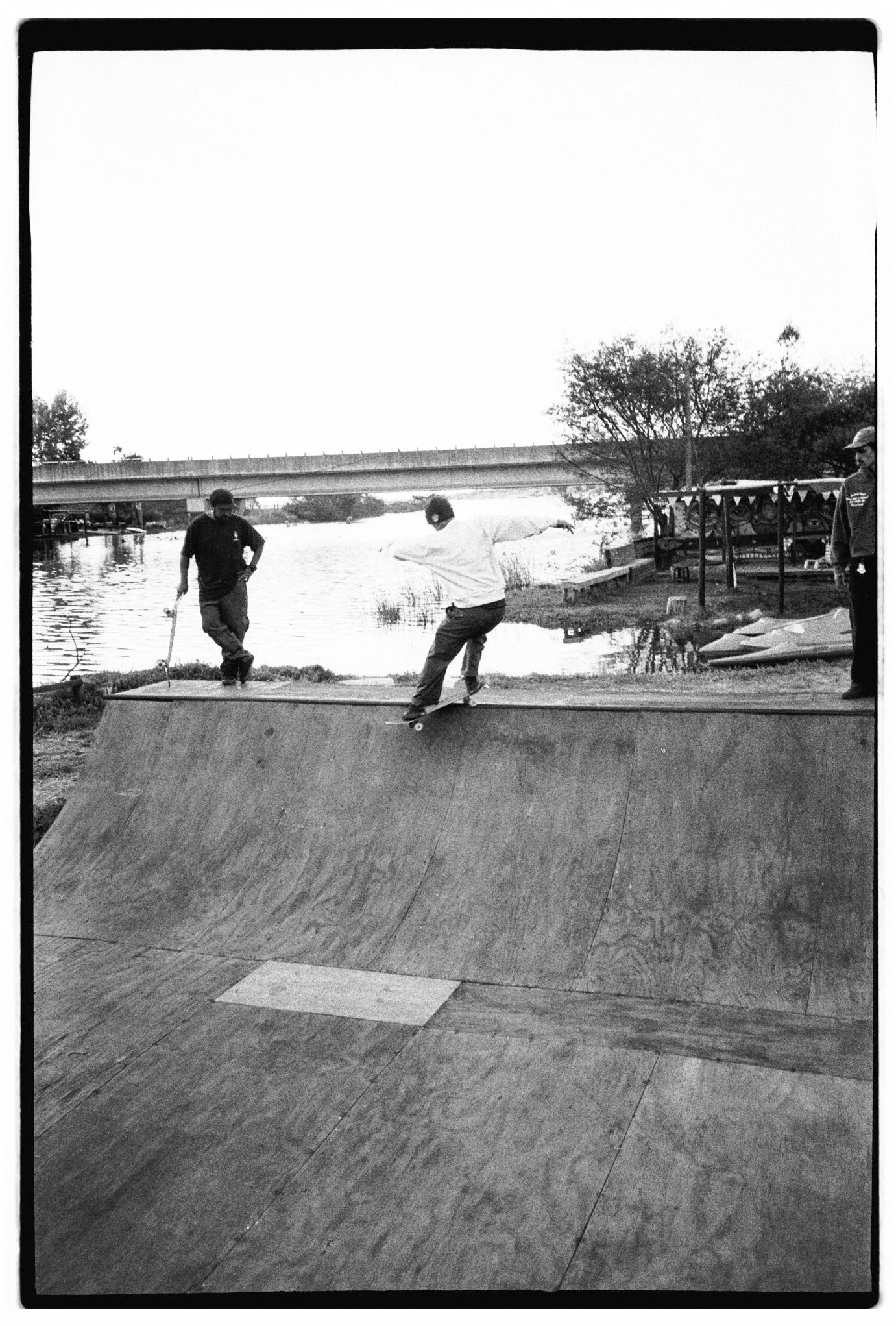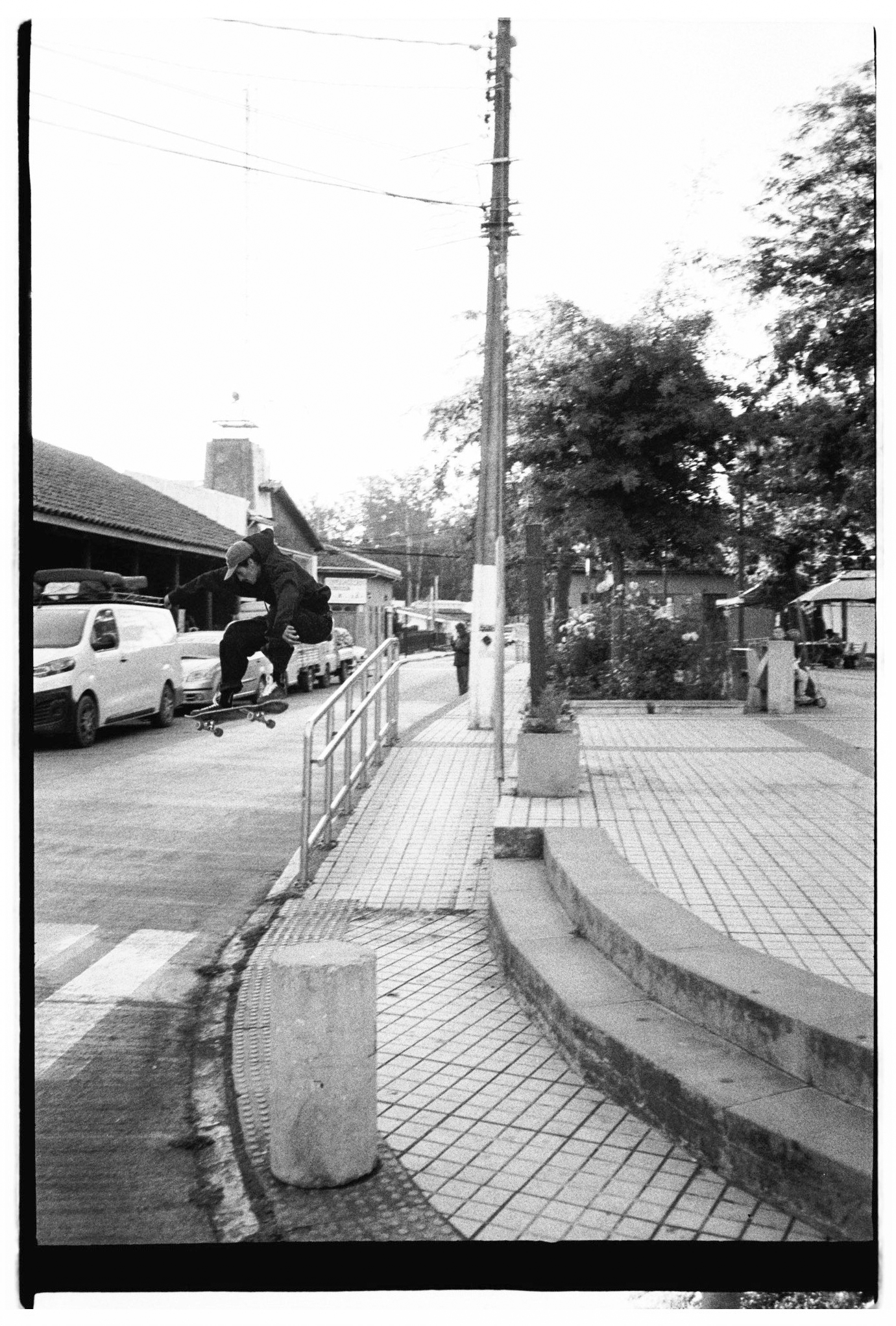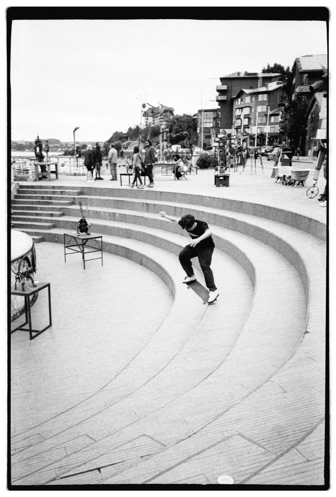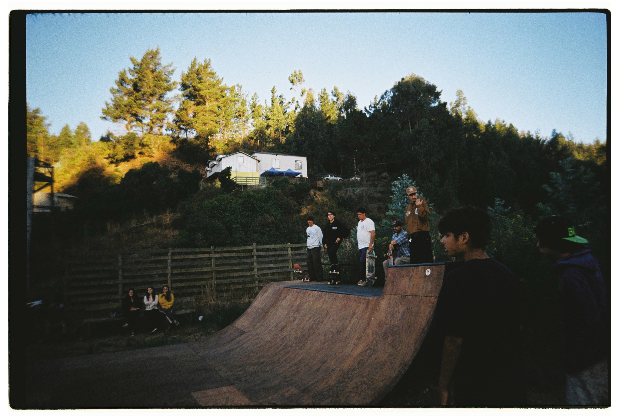 Viajamos por tierra desde Santiago a Chiloé. Pasamos por lugares como Curicó, Curanipe, Los Ángeles y Puerto Varas, llegando hasta Chiloé. La recepción fue brutal, la hospitalidad de la gente que nos recibió por el sur fue increíble. En cada lugar que llegamos nos recibieron como amigos de toda la vida, conociendo nuevos colegas y conectando con la cultura skater del sur de Chile.